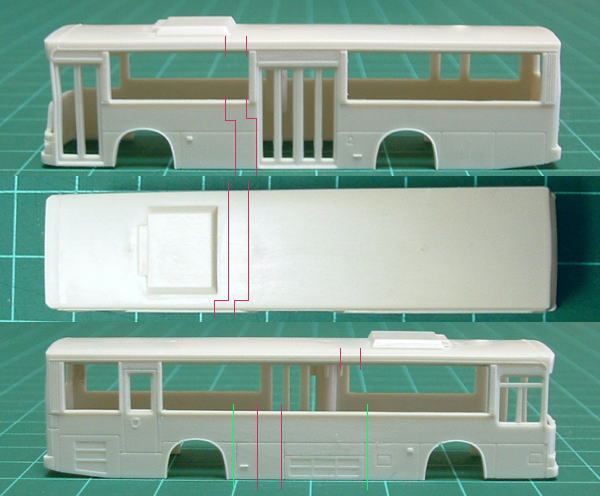 | 先ずは切り継ぎ位置を決定します。 モデルをよく見ると、特に公式側の屋根部分が側面の残したい部分とクーラー位置の関係で、 真っ直ぐ単純に切り継ぐ事が出来ず、L型形状にして切り継ぐ必要があるようです。 側面は真っ直ぐ切っても良いのですが、パネル分割位置の関係で今回こちらもL字型にして切り継いでいます。 クーラー後ろの切り取り位置をクーラー直後とせず余裕を持たせているのは、仕上げの際の”しろ”を取ってある為です。 管理人にはこの位置がベストですが、クーラー直後で切り継いで仕上げの手間を省く方法もあります。 各人工夫を。 注:上の画像の線は大体の位置です。 実際には現物合わせで正確な位置出しを行って下さい。 また、中引き戸車もほぼ同様工法、後ろドア車はもっと簡単に切り継ぎ出来そうです。 *非公式側側面の緑線は、もう一台種車が用意出来て拘りたい場合の線です>後述参照 |