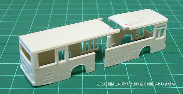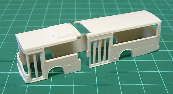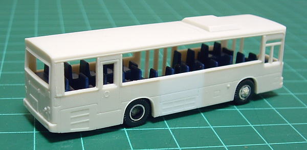 | そして出来たのがこれ(今回の車両は諸事情から切り継ぎ位置がAとは合っていません)、リアホイール直前の車側灯なしの形態です。 車側灯がある車両の場合、さらにルーバーの形状変更などの加工が必要、1/150のバスでそこまで必要かは??ですが… 今のところ車番を決めていないのでこの状態で加工を終了しています。 窓もこれから考えますが…何気に一番厄介かも?? |
