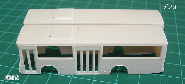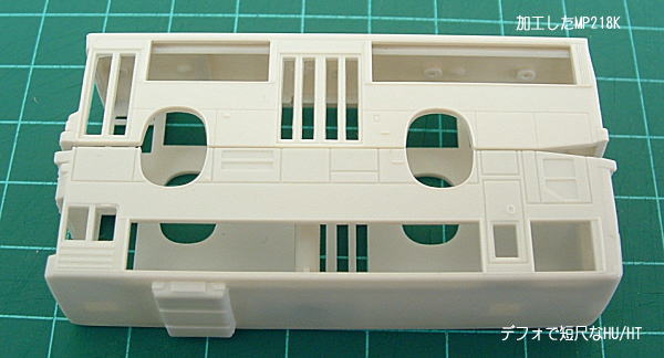 | ご存知の通り4弾MP218は標準尺(WB=5.3m)がプロトタイプですが、これをMP218K(WB=4.8m)にしてみました。 今回は都営バスとして組む為、中4枚折り戸車:ベースは北海道中央(ボディー的には京王・名古屋市も同じ)を選択しています。 実車とモデルを観察すると、側面は前ドア〜中ドア間の短縮、屋根はクーラー後ろを短縮するとOKなようです。 |