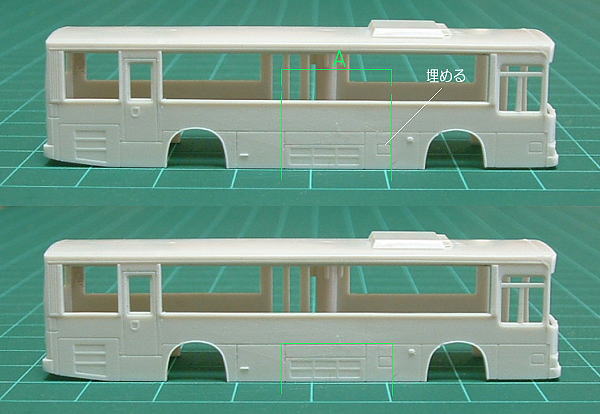 | *さて、拘りたい方はもう一点加工が必要なようです。 これは非公式側のルーバー位置と側面パネルの構成を正しくする加工で、別の車体からAの部分(給油口モールドは埋める)を切り取り、 短縮した車両の後輪直前にはめ込みます。 (Aの部分は加工の仕方によっては下のような切り取り方でもOKでしょう) |