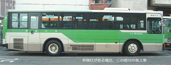 | 車側灯のない車両の例(都営H-N496) 左の車両は付いてますね(車番不明) W代〜X代辺りが付く付かないの境目かも?? 都営バスの場合、非公式側車側灯なしの車両は公式側も無いようです。 モールド削除を忘れずに… また、この画像のN代のように、少し前の世代はテールライトの形状やリアバンパー内の灯具類、エンジンルーバーもバスコレ製品と 違う場合があるようです。 最後に、ここでは違いや工法を色々書いておりますが、何処まで拘るか〜どうやって作るかは工作する人の自由です。 〜(何々)〜じゃなければならない ではありませんので自由に楽しく工作しましょう。 関連ページ:都営バス駄画像倉庫 上掲実車画像の大きいもの等あります。 |